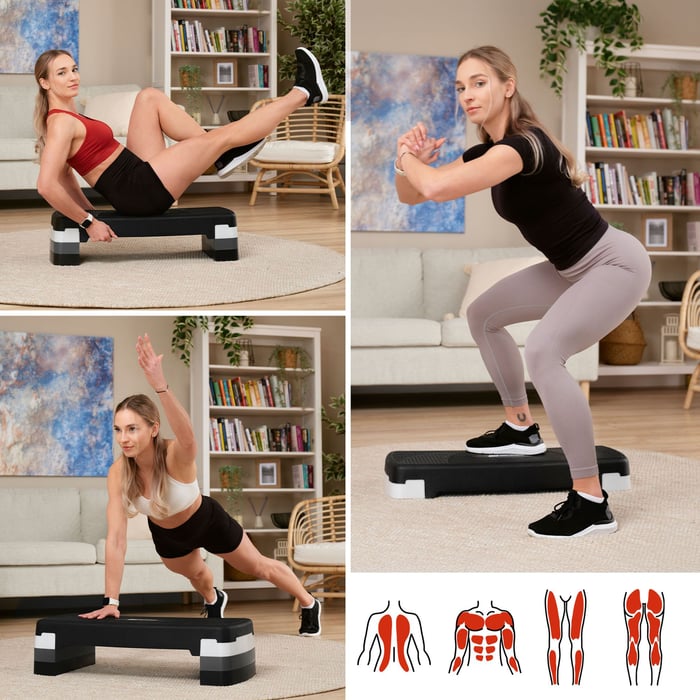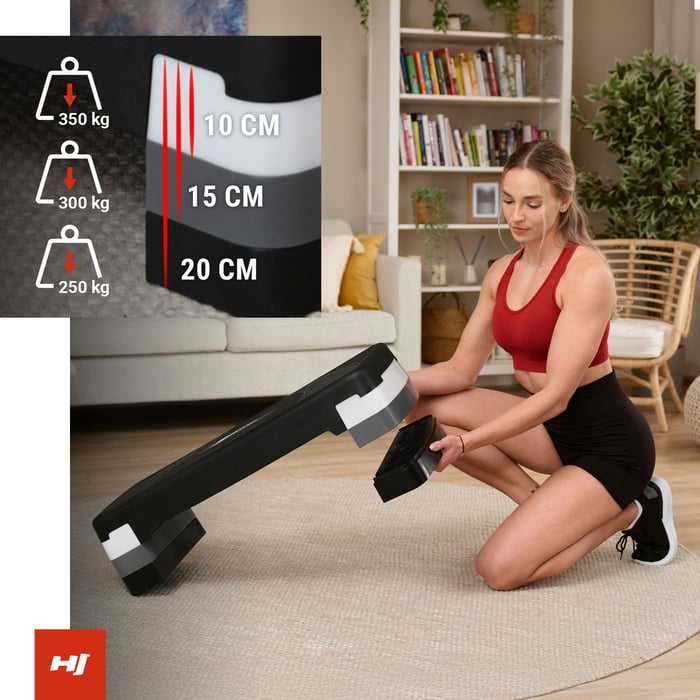 Passen Sie die Höhe des Steppers an Ihre Bedürfnisse und die Intensität Ihres Trainings an! Der Aerobic-Stepper bietet drei Höheneinstellungen: 10 cm, 15 cm und 20 cm, sodass Sie den Schwierigkeitsgrad mit Ihren Fortschritten steigern können. Die Belastbarkeit ist für jede Stufe optimal angepasst, um maximale Sicherheit zu gewährleisten: