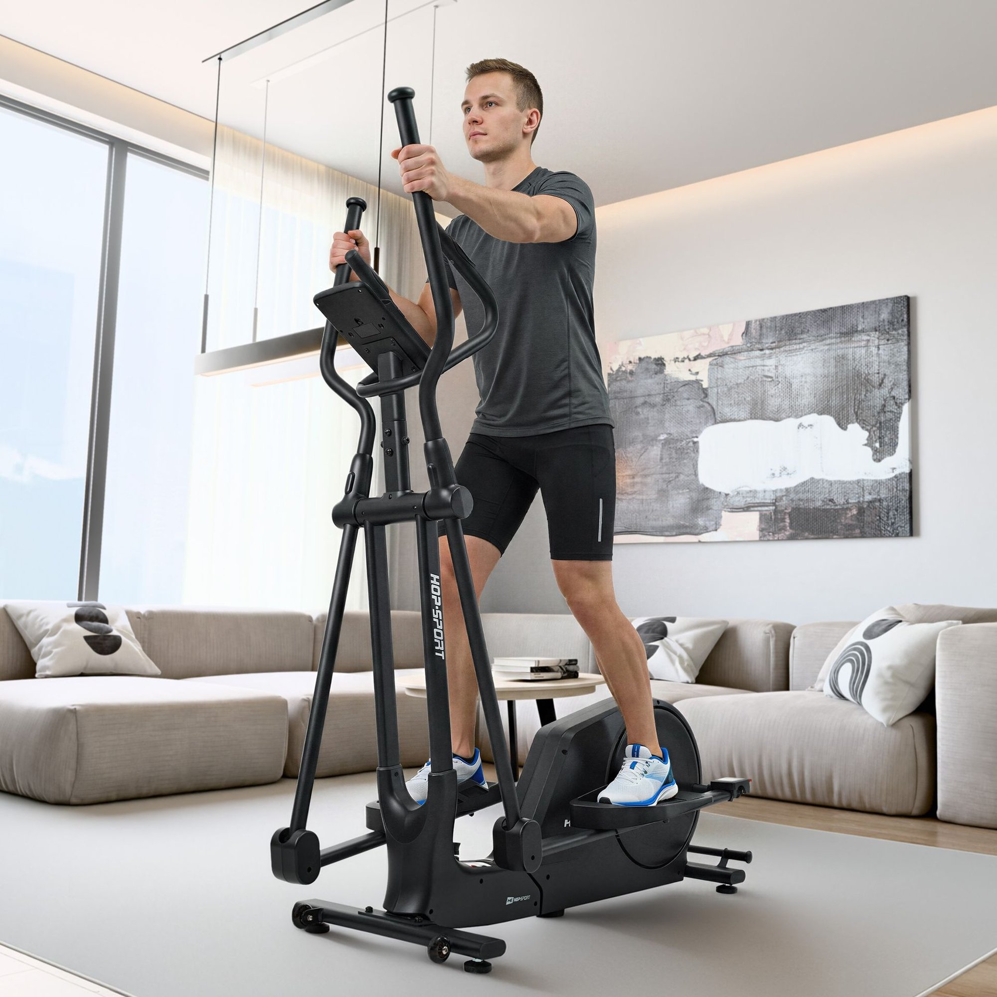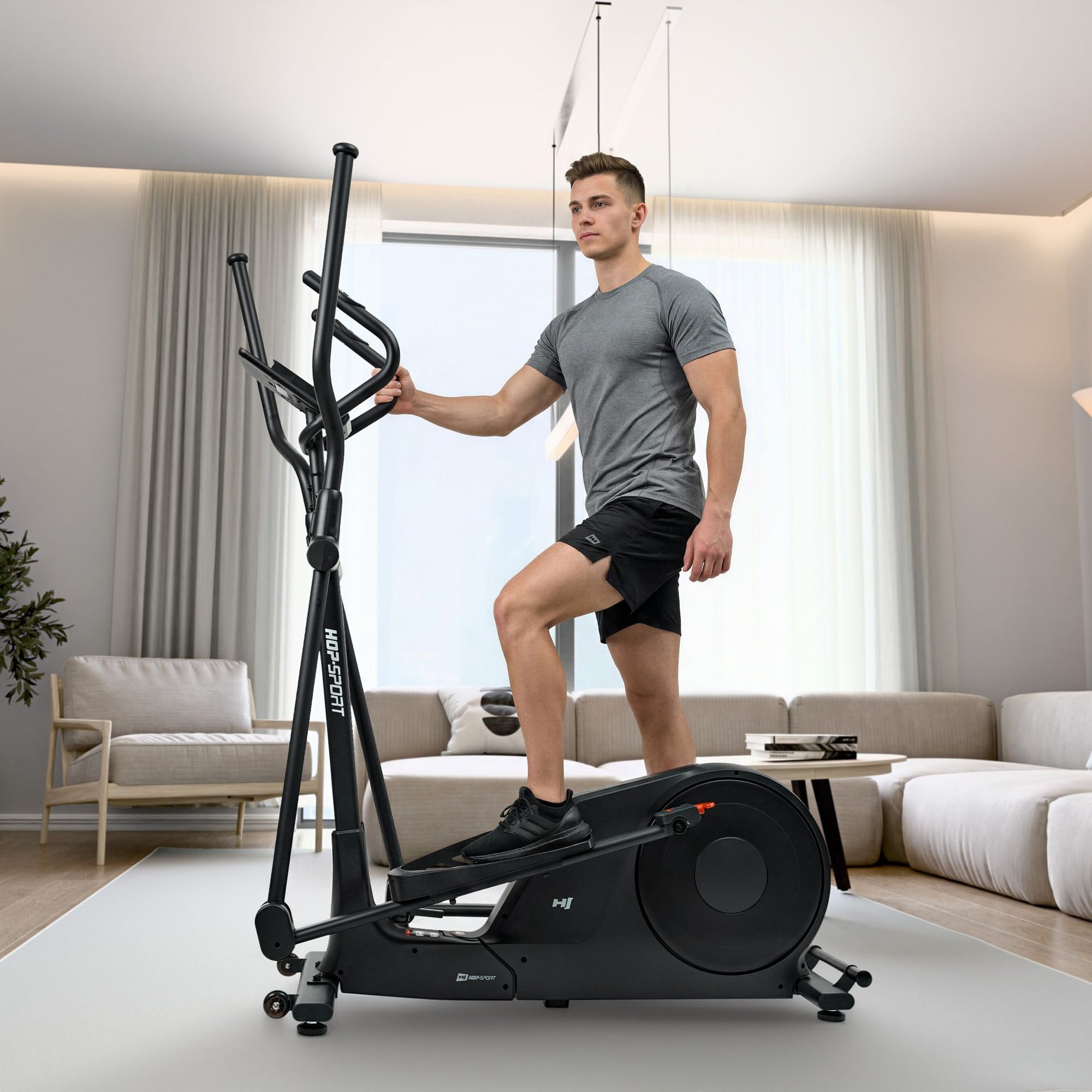 Der HS 5100C Floud ist ein Heimtrainer, den Sie nach dem Training vertikal abstellen können, ideal um Platz zu sparen. Das Klappsystem funktioniert ähnlich wie bei modernen Laufbändern. Mit einem leichten Druck Ihres Fußes klappt das Gerät automatisch in die vertikale Position. Hinten befindet sich ein robuster Transportgriff, der das sichere Zusammenklappen erleichtert. Dies ist eine praktische Lösung für alle, die nicht möchten, dass der Crosstrainer den halben Raum einnimmt.