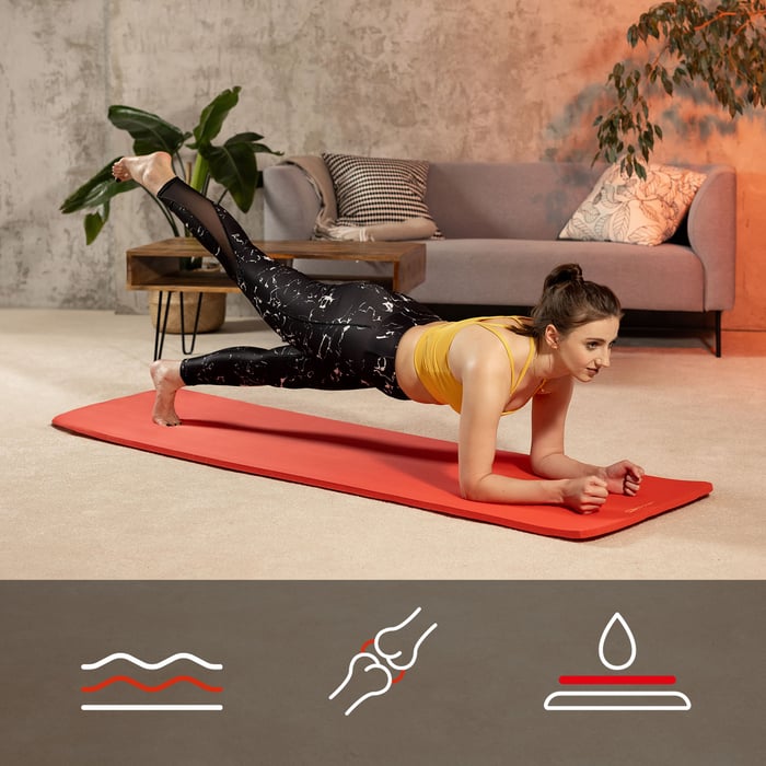 Die 1,5 cm dicke NBR-Fitnessmatte ist für verschiedene Trainingsarten geeignet. Darauf können Yoga, Pilates, dynamische Cardio- und Kraftübungen ausgeführt werden, die die Gelenke stärker belasten. Solche Übungen erfordern eine angemessene Isolierung und Dämpfung, die vor dem harten Boden schützen. Die Kombination aus der Dicke von 1,5 cm und den größeren Abmessungen der Matte sorgt für Komfort und Sicherheit bei jeder Trainingseinheit. Zudem bietet die einzigartige Struktur der Matte eine hervorragende Griffigkeit. Dies ermöglicht wiederum eine stabile Körperhaltung und eine präzise Ausführung komplexer Bewegungen beim Krafttraining.