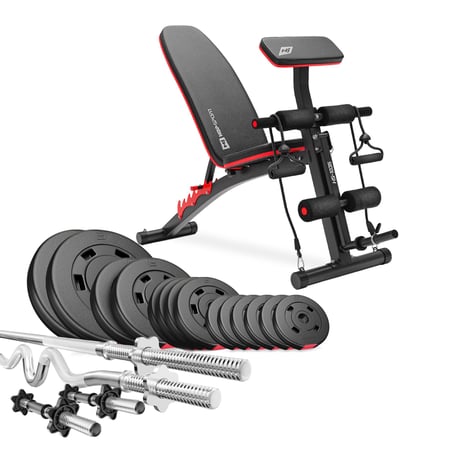 Komplett Set - Hantelbank HS-1035 mit 66 kg Kunststoff Hantelset mit 1 x Super SZ-Curlstange 120 cm, 1 x Langhantelstange 167 cm und 2 Kurzhantelstangen, inklusive Sternverschlüße.