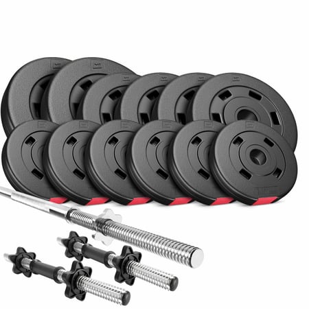 Kunststoff Hantelset 38 kg (2 x 5 kg, 4 x 2,5 kg, 6 x 1,25 kg) mit Hantelstangen Ø 30 mm: 2 x Kurzhantelstange 45 cm und 1 x Langhantelstange 167 cm inklusive 6 Sternverschlüße