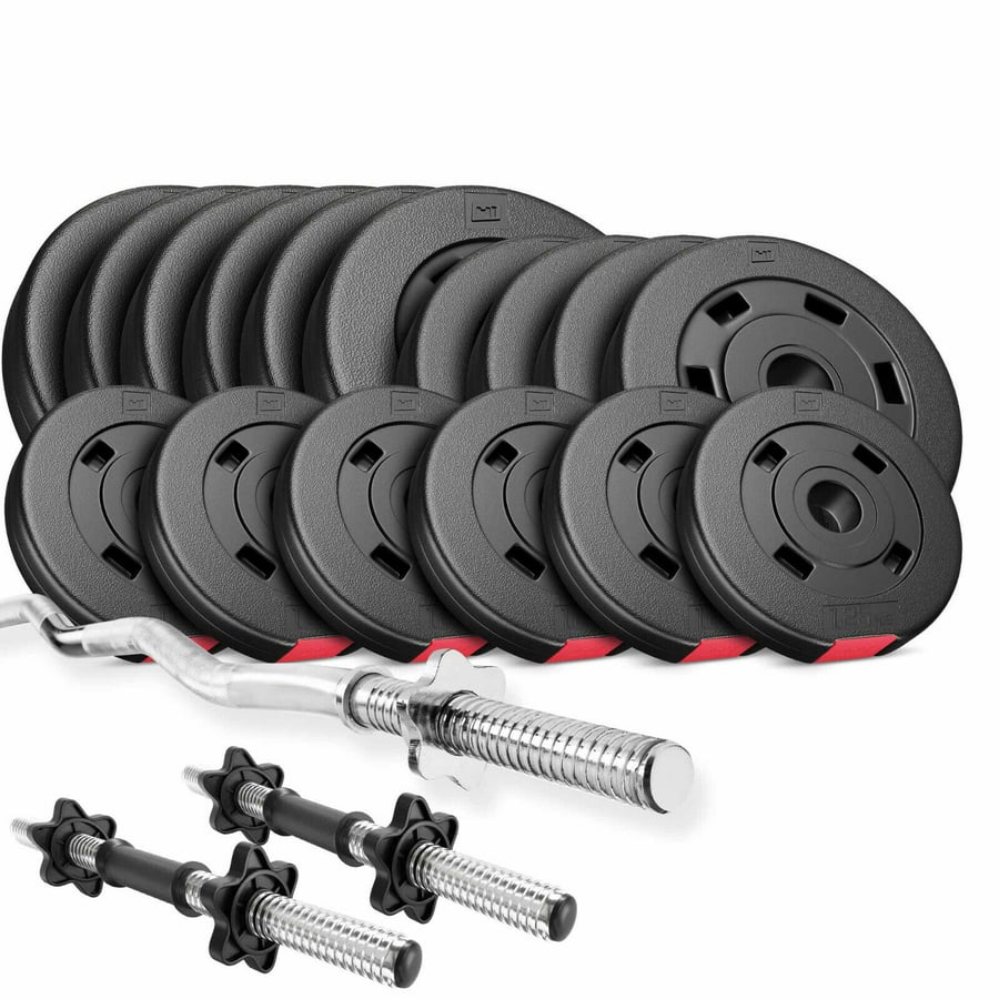 Kunststoff Hantelset 56 kg (6 x 5 kg, 4 x 2,5 kg, 6 x 1,25 kg) mit Hantelstangen Ø 30 mm: 2 x Kurzhantelstange 45 cm und 1 x SZ-Curlstange 120 cm inklusive 6 Sternverschlüße