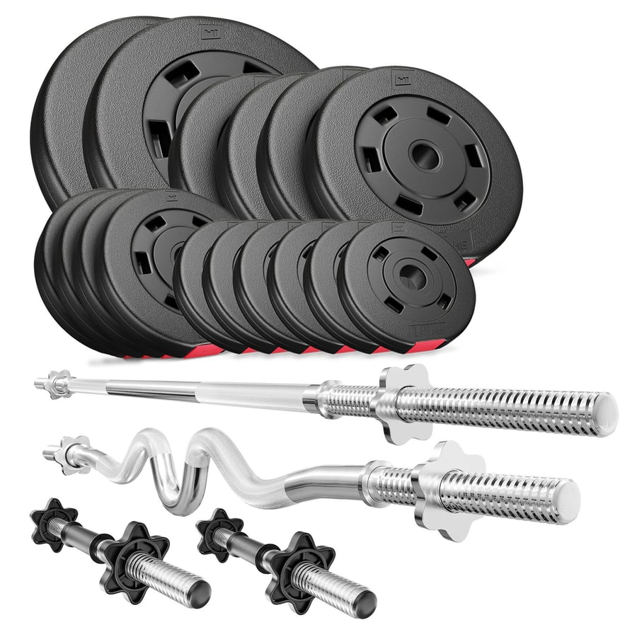 Kunststoff Hantelset 76 kg (2 x 10 kg, 4 x 5 kg, 4 x 2,5 kg, 6 x 1,25 kg) mit 1 x Super SZ-Curlstange 120 cm, 1 x Langhantelstange 167 cm und 2 Hantelstangen 45 cm inklusive 8 Sternverschlüßeln.