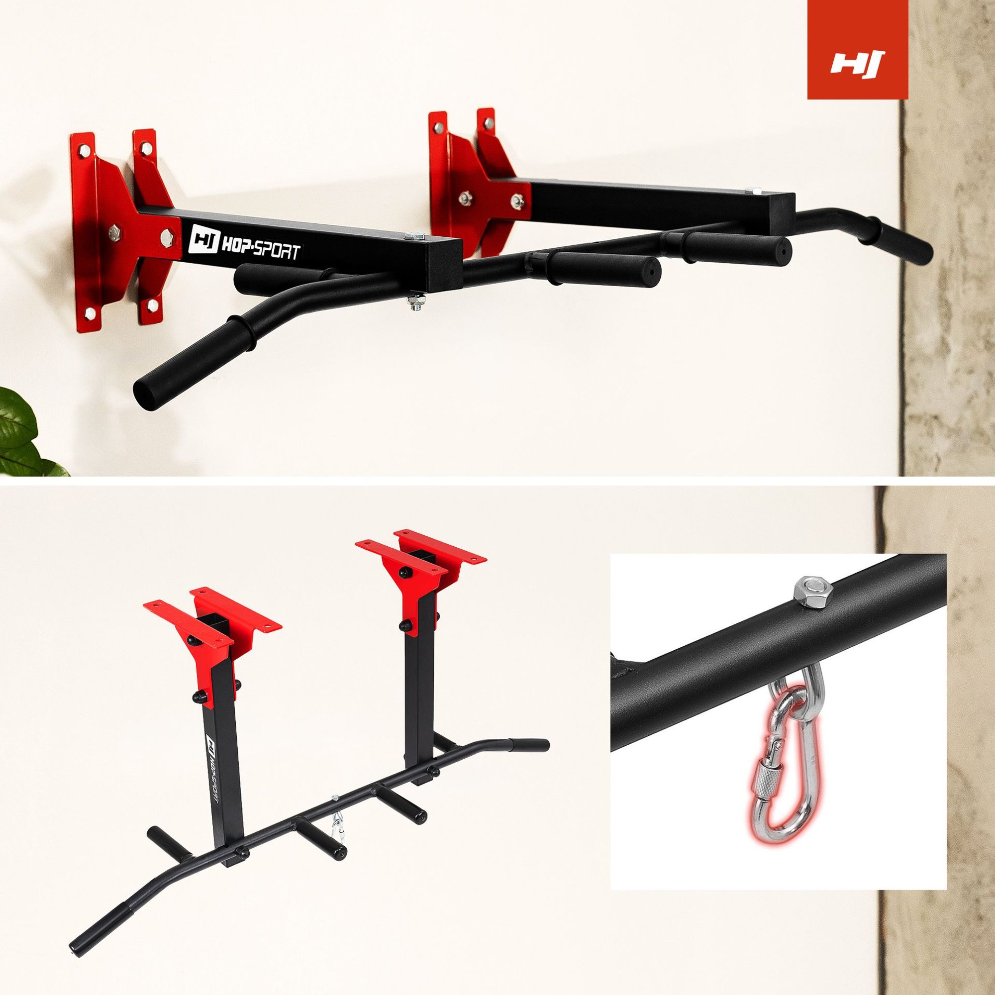 Die Klimmzugstange HS-2006K von Hop-Sport ist mit einem zusätzlichen, robusten Halter ausgestattet, der vielfältige Trainingsmöglichkeiten bietet. Dieser Halter kann für die Befestigung von Boxsäcken oder TRX-Bändern verwendet werden, wodurch das Trainingsspektrum erheblich erweitert wird. Der Halter besteht aus einem starken Stab mit einer Dicke von 8 mm, was für eine hohe Stabilität und Sicherheit sorgt.