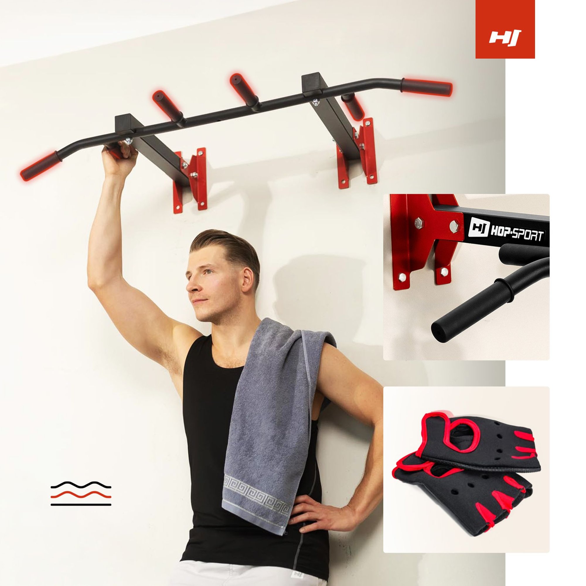 Der universelle Wand- und Decken-Klimmzugstange HS-2006K mit Handschuhen eignet sich ideal für das Heimtraining. Regelmäßiges Training an der Stange formt Trizeps, Brust-, Rücken- und Bauchmuskeln. Für maximale Sicherheit wurde die Stange vom Europäischen Qualitätszentrum geprüft. Die maximale Belastung beträgt 150 kg.
