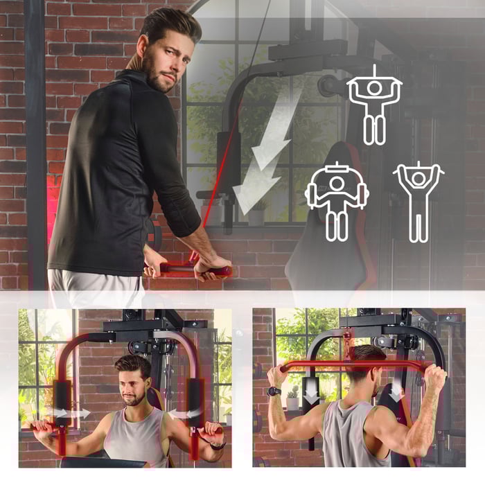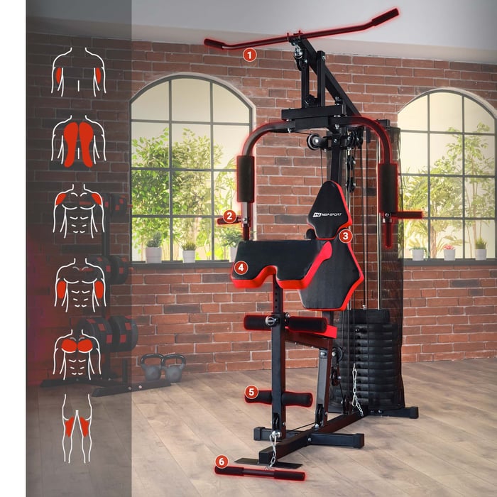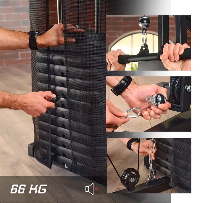 Für den Fitnessraum von zu Hause aus, ist die Kraftstation HS-1044K die perfekte Lösung. Die pulverbeschichtete, solide Stahlkonstruktion hält einen maximalen Benutzergewicht von 120 kg stand. Die Gewichte als auch die Zugseile, welche während des Trainings unter Spannung stehen, sind mit einem Sicherheitsnetz umgeben. Des Weiteren sind die Zugseile mit einer Gummischicht ummantelt und über Rollen geführt, welche wiederum extra gelagert sind. Hierdurch ist ein sicheres und komfortables Training garantiert.