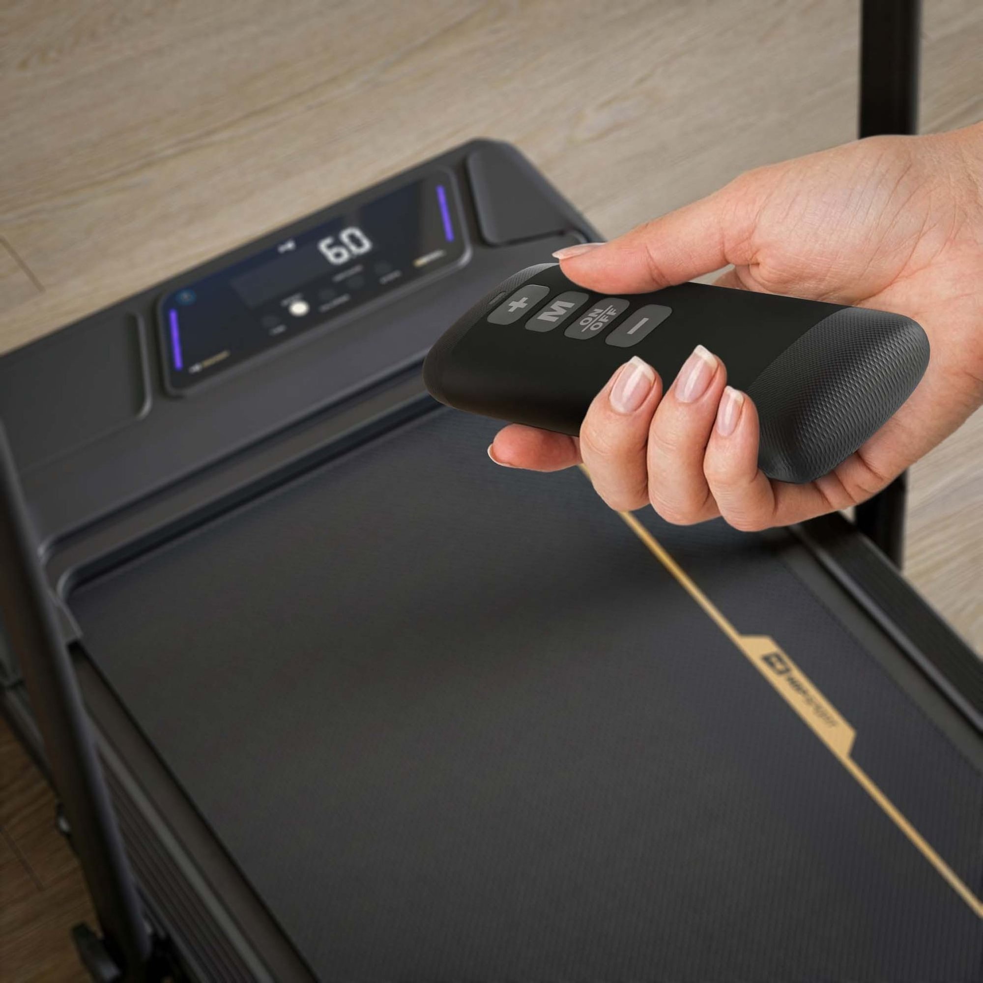 Das Heimlaufband HS-950WP kann über Bluetooth mit der kompatiblen Kinomap-App (Download erforderlich) verbunden werden. So können Sie Fortschritte verfolgen, virtuell trainieren oder sich mit anderen Nutzern messen. Gesteuert wird das Laufband entweder über einen Hand-Controller mit Halterung oder über das Bedienfeld mit Smartphone-Ablage, das geschlossen werden kann – alle Einstellungen sind jederzeit griffbereit. Der Sicherheitsschlüssel stoppt das Band im Notfall sofort und sorgt für mehr Sicherheit und Komfort beim Training. Ein Bluetooth-Laufband mit Funktionen, die das tägliche Training zu Hause deutlich erleichtern.