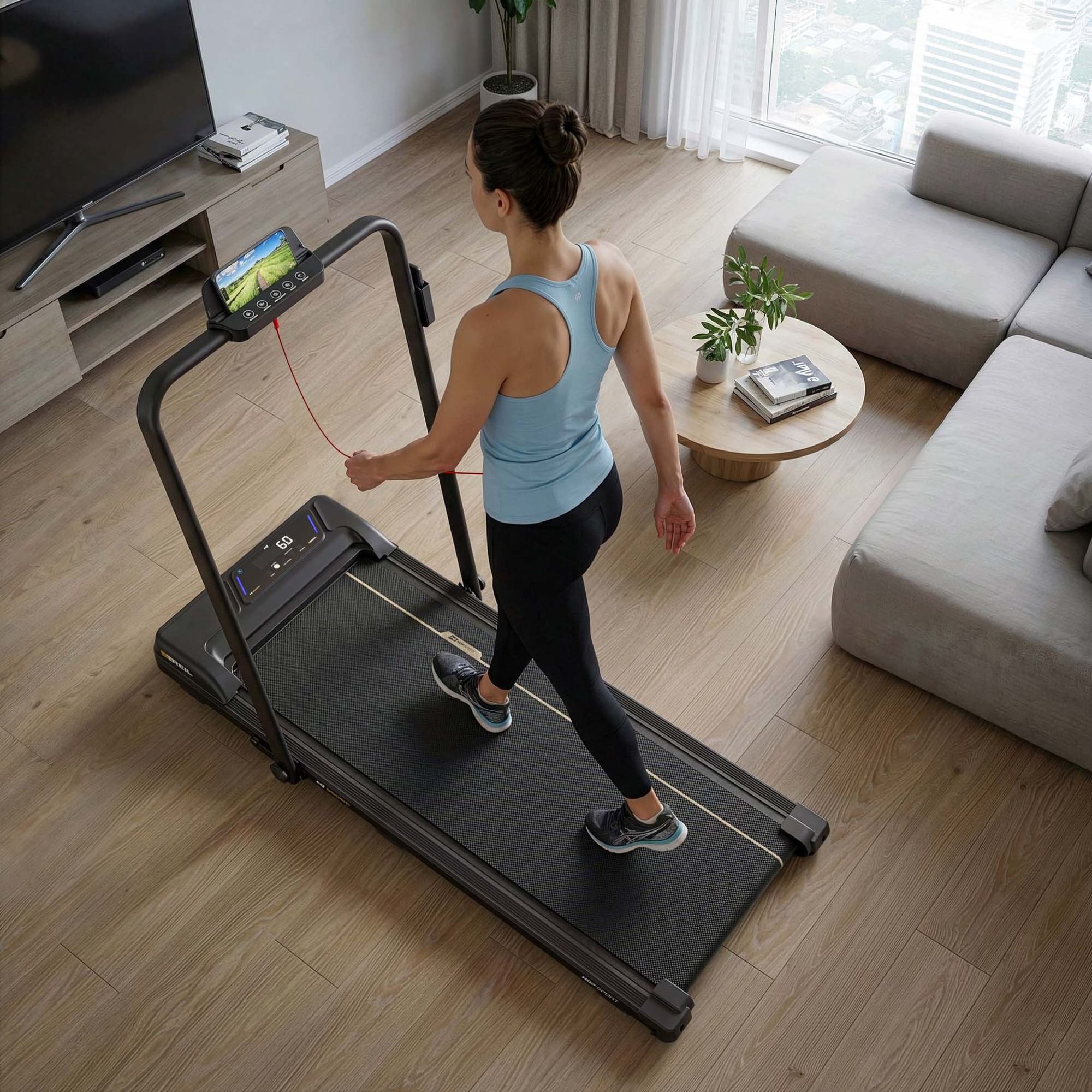 Kompaktes, leises Laufband mit 2-in-1-Funktion, Bluetooth, LED-Display und Kinomap-App. 1–6 km/h, 105 × 40 cm Lauffläche, ideal für Wohnung und Homeoffice.