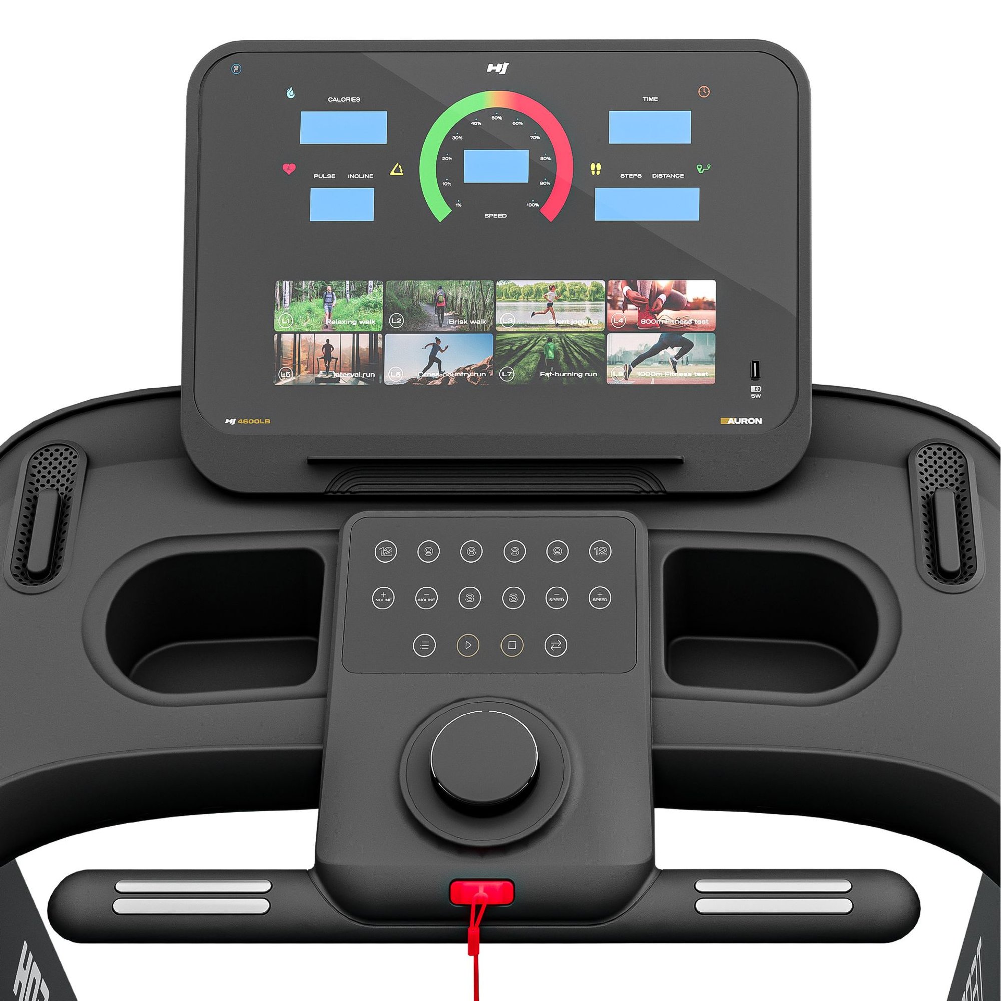Das klappbare Laufband HS-4600LB Auron verfügt über ein modernes Bedienfeld mit Bluetooth und USB-C. So können Sie Ihre mobilen Geräte verbinden und während des Trainings Ihre Lieblingsmusik hören.