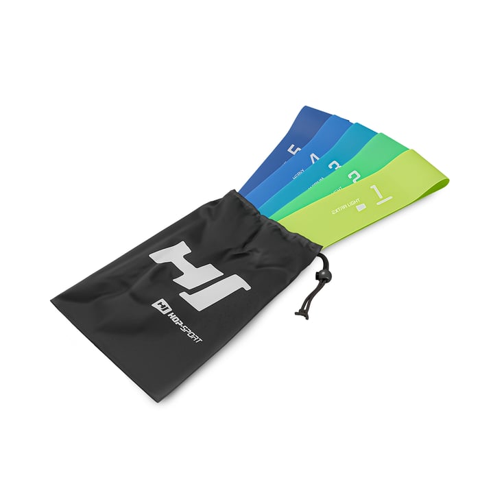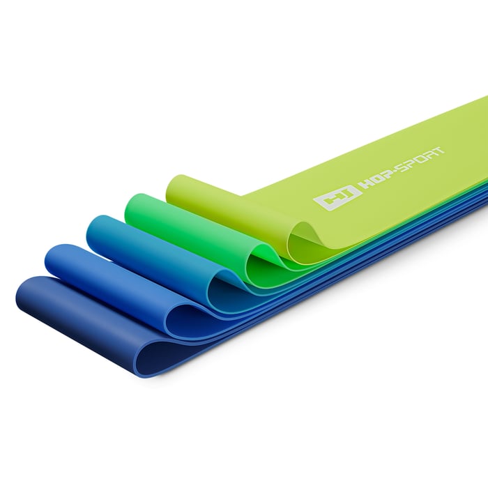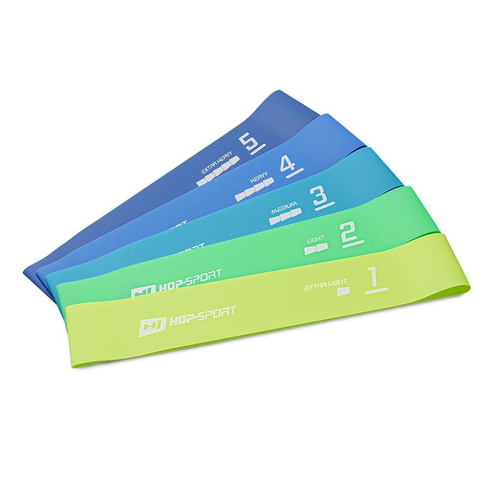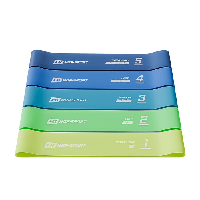 Jedes der fünf Fitnessbänder HS-L650RLB erzeugt einen anderen Widerstandsbereich - nacheinander vom hellsten zum dunkelsten: 2,5-4,5 kg, 4,5-7 kg, 7-9 kg, 11-14 kg, 14-18 kg .