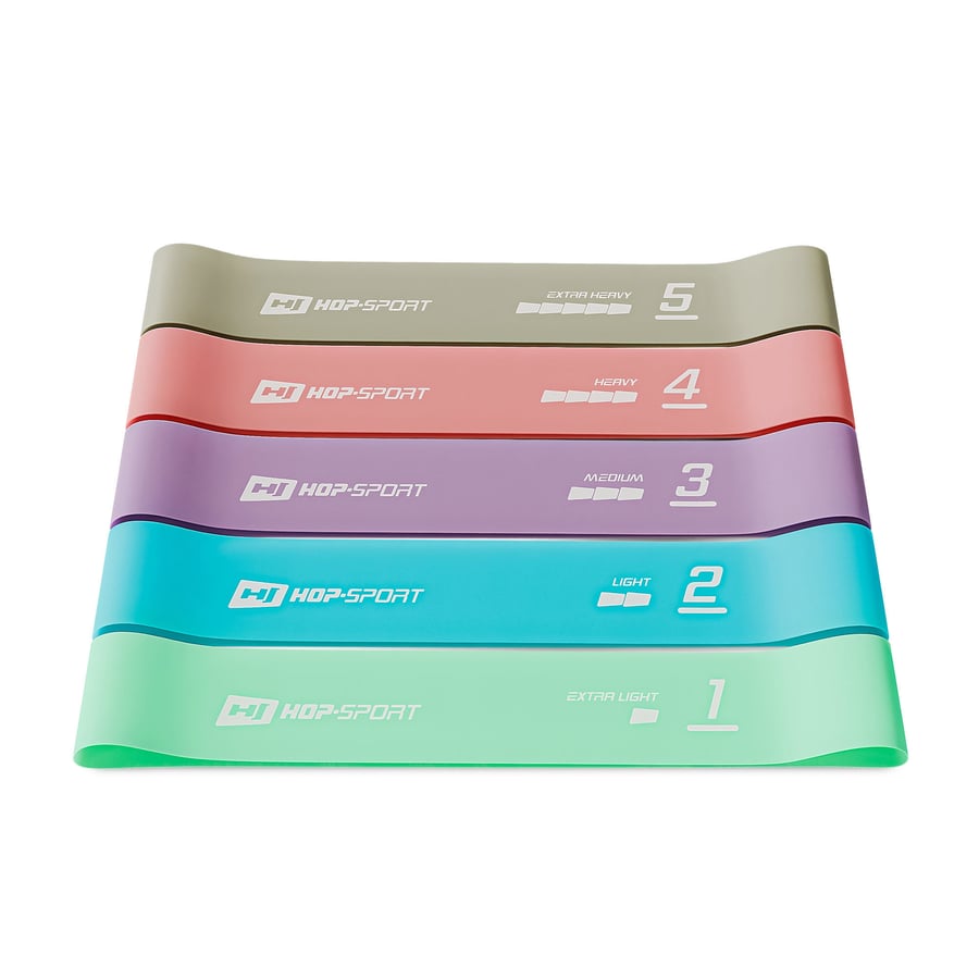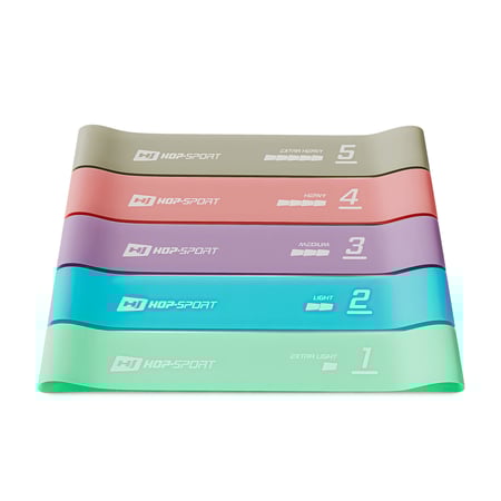 Jedes der fünf Fitnessbänder HS-L650RLL erzeugt einen anderen Widerstandsbereich - nacheinander vom hellsten zum dunkelsten: 2,5-4,5 kg, 4,5-7 kg, 7-9 kg, 11-14 kg, 14-18 kg .