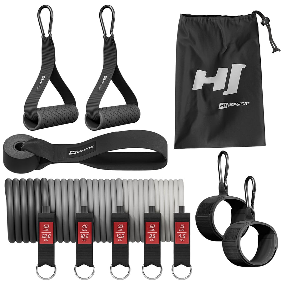 Das Widerstandsbänder-Set von Hop-Sport besteht aus fünf Expandern mit unterschiedlichem Widerstandsgrad von 4,6 kg bis 22,8 kg. So können Sie die Intensität der Übungen an Ihre Bedürfnisse anpassen und den Schwierigkeitsgrad schrittweise erhöhen. Das verstellbare Befestigungssystem bietet Ihnen die Möglichkeit, alle Gummibänder gleichzeitig zu verwenden. So können Sie eine maximale Belastung von 68,2 kg erreichen! Im Lieferumfang enthalten sind auch 2 Griffe, 2 Fußmanschetten, ein Türanker und eine praktische Aufbewahrungstasche.