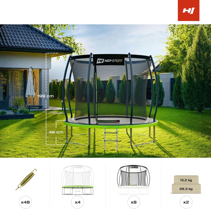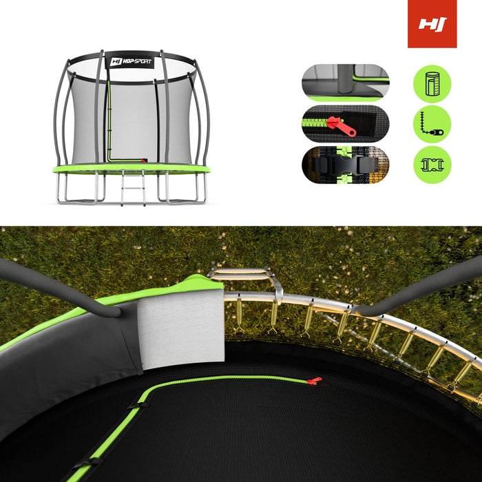 Das Gartentrampolin HS-PT08I von Hop-Sport ist die perfekte Wahl! Dank hochwertiger Verarbeitung, stabiler Konstruktion und zahlreicher Sicherheitsvorkehrungen können Sie unbeschwerte Sprünge in einer komfortablen und sicheren Umgebung genießen. Dieses Modell besticht durch ein attraktives Design und ein innovatives, inneres Sicherheitsnetz im „Pumpkin“-Stil, das den Komfort bei der Nutzung des Trampolins noch weiter erhöht.