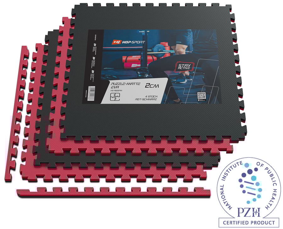 Extra dicke Puzzlematte von Hop-Sport, 4 Stück mit grossen 60x60 cm Platten, idealer Bodenschutz, wasserabweißend und rutschfest, einfach kombinierbar mit anderen Sets, Schwarz/Rot